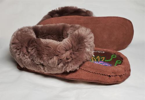 Done in the cinnamon standard suede with our mocha Rex rabbit fur trim. Fleece lined with high density memory foam insole.